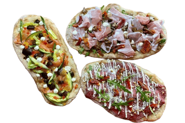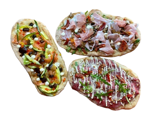 Ambachtelijk gerookte zalm, roomkaas, cheddar, rode ui, pijnboompitten en rucola.